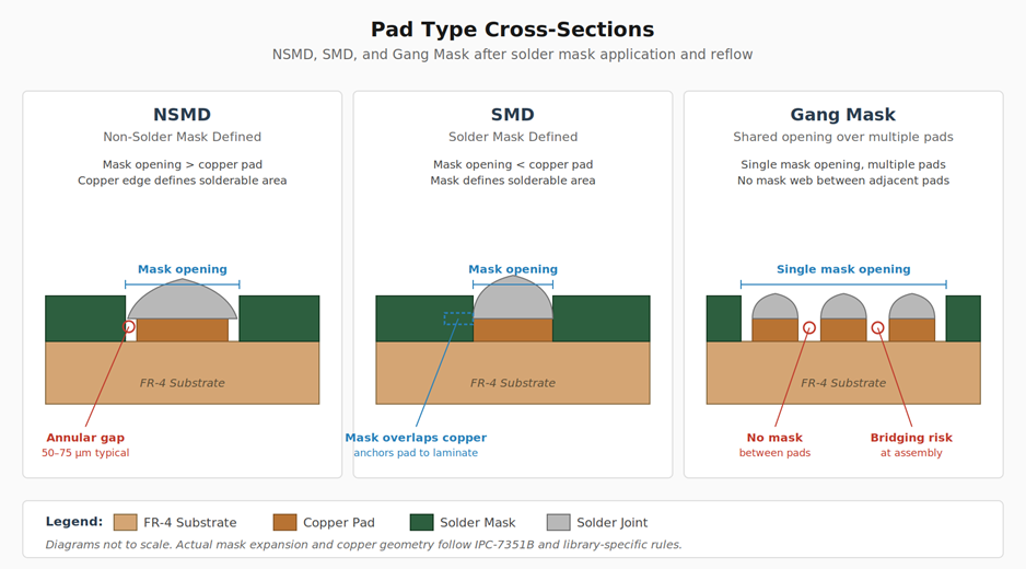 If you've ever paused before publishing a footprint to your library and wondered whether the pad should be Solder Mask Defined (SMD), Non-Solder Mask Defined (NSMD), or part of a Gang Mask, you're asking the right question. It's one of those choices that looks small on the screen but quietly decides whether a board survives reflow, thermal cycling, and ten years in the field.